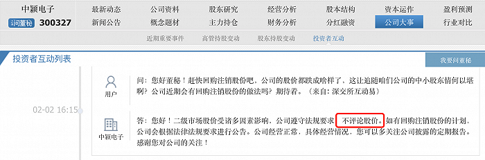 就在投资者2月2日收盘后吐槽“公司的股价都跌成啥样了,这让追随咱们公司的中小股东情何以堪啊?”的时候,中颖电子回应称“二级市场股价受诸多因素影响,公司遵守法规要求,不评论股价。如有回购注销股份的计划,公司会根据法律法规要求进行公告。公司经营正常,具体经营情况,您可以多关注公司披露的定期报告。感谢您对公司的关注!”