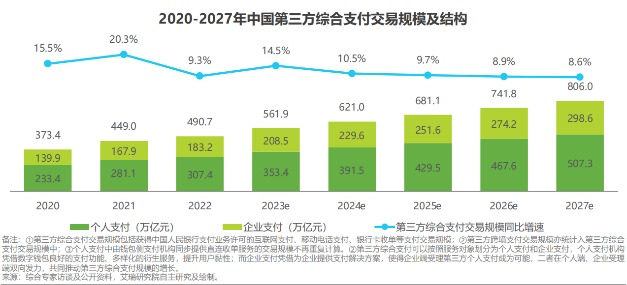 根据艾瑞咨询2023年发布的《中国第三方支付行业研究报告》(以下简称《报告》),全球跨境B2C电商交易跨境电商已成为未来全球贸易增长的重要支持力量,是跨境支付的发展沃土;而传统贸易模式(即B2B贸易模式)体量巨大,且近年来逐渐呈现小额化、碎片化趋势,是跨境支付企业的未来蓝海市场。