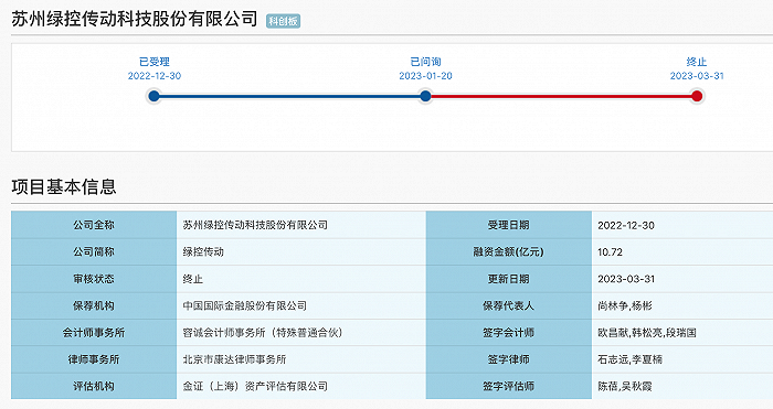 从上交所网站信息,此前绿控传动的保荐机构也是中金公司,会计师事务所也没变,只是此前的律师事务所为北京市康达律师事务所。从披露来看,上一次,绿控传动是2022年12月30日获得的受理,2023年1月20日进入问询环节,2023年3月底终止IPO。