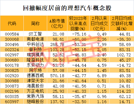 拉长时间来看,概念股整体处于超跌状态。数据宝统计,截至2月26日收盘,概念股今年以来平均下跌15.16%。2月26日收盘价与2023年以来高点相比,平均回撤幅度为36.75%。ST工智、南都电源、中科创达、普利特回撤幅度逾50%。