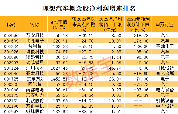 从业绩数据来看,按照预告净利润下限计算,6只理想汽车概念股净利润翻倍增长或扭亏为盈,分别是利欧股份、万安科技、均胜电子、方正电机、普利特、继峰股份。其中利欧股份净利润增幅最明显,公司预计2023年净利润为19亿元至21亿元,同比扭亏为盈。报告期内,公司持有的理想汽车股票以及报告期处置的部分理想汽车股票合计确认的损益金额约为23.42亿元人民币。