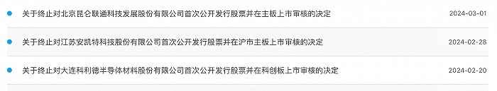 据上交所,自春节前认养一头牛撤回IPO申请之后,春节后的2月20日披露,大连科利德半导体材料股份有限公司的保荐人海通证券申请撤销保荐工作;2月28日披露,因公司和保荐人双双撤回,江苏安凯特科技股份有限公司推出IPO的工作;3月1日披露,北京昆仑联通科技发展股份有限公司也加入了撤回IPO的行列。