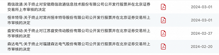 而北交所,也有类似情况,放弃排队选择终止。交易所2月20日披露,森达电气(831406.NQ)终止,2月27日披露盛安传动(831860.NQ)终止,3月1日终止的有两家,分别为恒丰特导(836249.NQ)和商信政通(873876.NQ)。