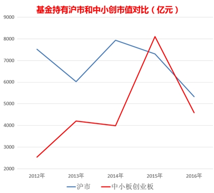 2016年年底基金持有深市的主板、中小板和创业板的总市值合计为6390.4亿元,仍然高于基金的沪市持股市值。