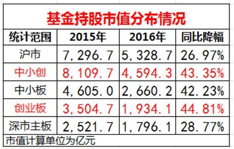 天相统计数据显示,2016年年底权益类基金(含指数基金)持有中小板股票市值为2660.2亿元,持有创业板股票市值为1934.1亿元,分别为2015年年底的基金持有市值低了42.23%和44.81%。