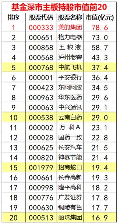 基金2016年年底重仓深市主板市值最多的两只股票分别为美的集团和格力电器这两只家电股,持股市值分别为78.6亿元和73亿元。