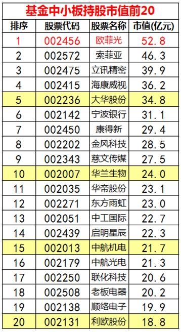 基金2016年年底重仓中小板市值前三名的股票分别为欧菲光、索菲亚和立讯精密,持股市值分别为52.8亿元、46.3亿元和39.9亿元,均大幅低于2015年年底基金中小板第一重仓股奥飞娱乐对应的82.2亿元。