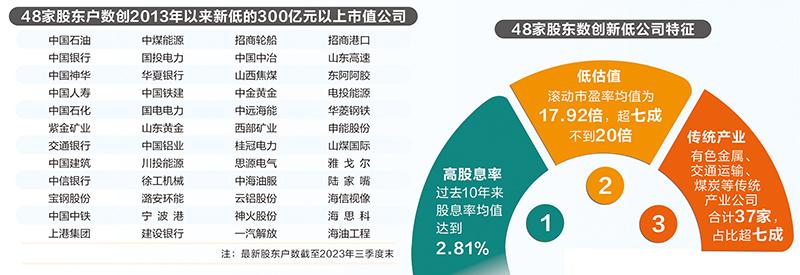 A股还有哪些行业龙头公司股东户数呈现减少趋势?以3月15日A股市值超300亿元的公司为样本(注:下文所述行情,如无特别说明,均截至3月15日),证券时报·数据宝统计发现,按年度计算(由于绝大多数公司尚未披露2023年年报,2023年股东户数取三季度末计算),截至2023年三季度末,股东户数创下2013年以来新低的公司有48家。