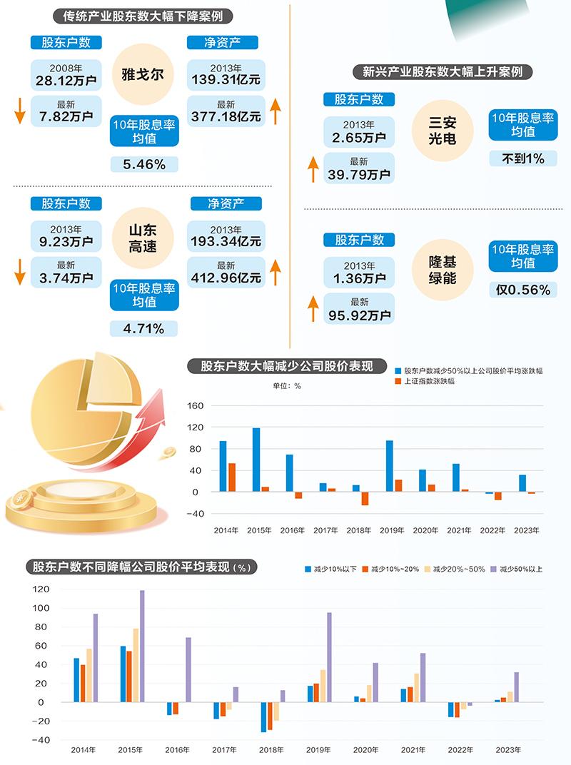 2014年上证指数涨幅达到51.66%,创近10年最大涨幅;当年股东户数降幅50%以上的股票平均涨幅达到94.02%,高出上证指数41.15个百分点。到了2015年,股东户数降幅50%以上的股票平均涨幅达到118.71%,高出上证指数109.3个百分点。2022年上证指数遭遇大幅调整,全年下跌15.13%,股东户数降幅50%以上的股票平均下跌3.64%,跑赢同期上证指数11.49个百分点。