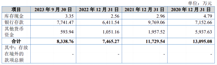 此外,2023年9月底,公司银行存款为7741.47万元。