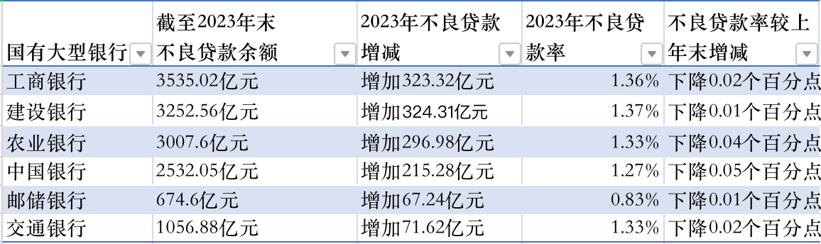 2023年国有六大行资产质量情况