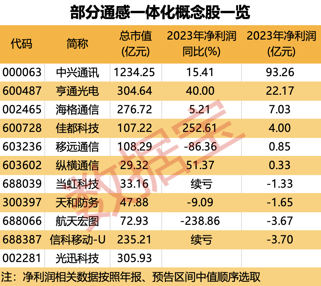 据证券时报·数据宝不完全统计,A股通感一体化概念股共计11只。从市值规模来看,中兴通讯居首,最新总市值为1234.25亿元;光迅科技、亨通光电总市值均超过300亿元;海格通信和信科移动-U总市值均在200亿元以上。