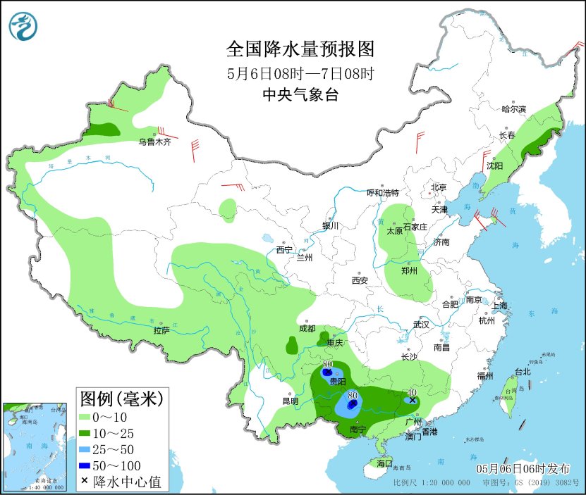 5月6日至8日,吉林东部、四川盆地南部、贵州西部和南部、云南东部、广西、广东大部、福建南部等地部分地区有中到大雨,其中,广西北部、贵州西部等地局地有暴雨;上述部分地区伴有短时强降水(最大小时降雨量20~40毫米,局地可超过50毫米),局地并伴有雷暴大风或冰雹等强对流天气。