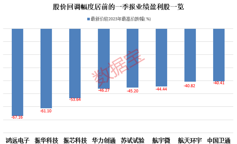 个股来看,五成概念股的最新股价较2023年高点回调幅度超40%,其中航天宏图、鸿远电子、振华科技的股价回调幅度居前,均超60%。剔除一季度业绩亏损的个股后,鸿远电子、振华科技、振芯科技、华力创通、中国卫通等8股回调幅度超40%。