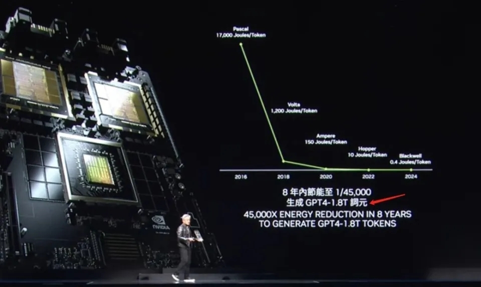 那么,Blackwell究竟是什么呢?它的性能之强大,简直令人难以置信。请仔细观察这些数据。在短短八年内,英伟达的计算能力、浮点运算以及人工智能浮点运算能力增长了1000倍。这速度,几乎超越了摩尔定律在最佳时期的增长。