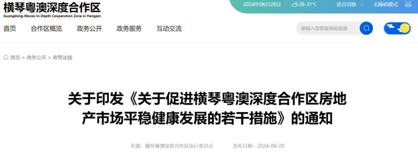 6月20日,横琴粤澳深度合作区印发《关于促进横琴粤澳深度合作区房地产市场平稳健康发展的若干措施》。