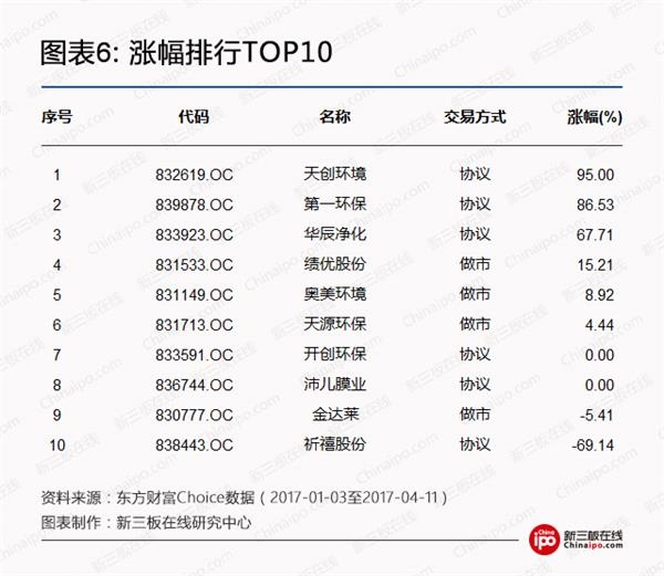 在今年以来的涨幅排行中,天创环境、第一环保表现较为惊人,高达95%、87%;其次为华辰净化,今年以来的涨幅为67.71%。