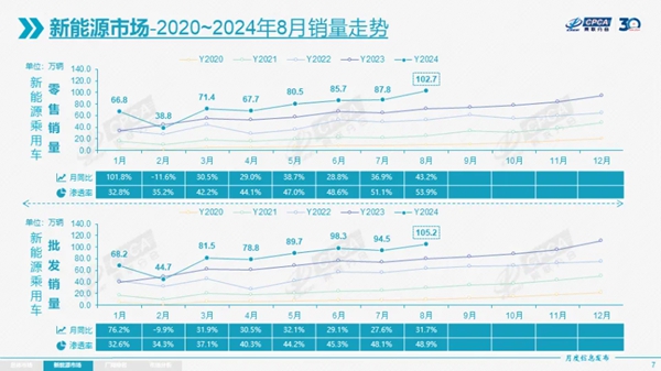8月,传统燃油车零售87.8万辆,同比下滑28%;新能源乘用车零售102.7万辆,同比增长43.2%,环比增长17%;渗透率再次突破五成,达53.9%,同比提升16.6个百分点;中国品牌新能源乘用车销售份额达73%,同比增长3个百分点。崔东树表示,新能源乘用车已经走出了区别于传统周期性规律的独立行情。