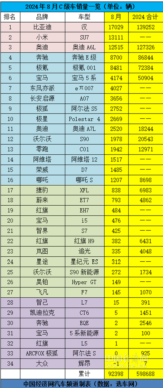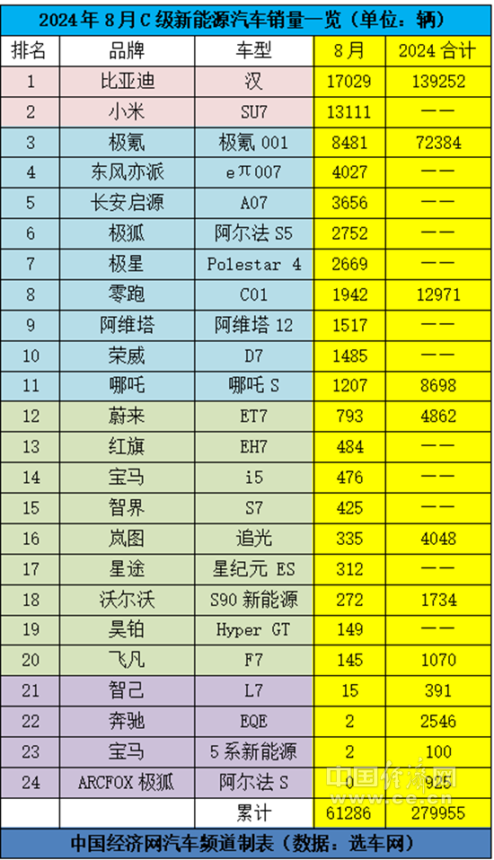 自带流量的小米SU7的8月销量突破1万辆,达13111辆,成功拿下新能源板块的亚军,同时也是整个C级车市场的亚军。据悉,目前小米汽车正在提升产能,并已开启双班生产,预计将在今年11月提前完成10万辆销量目标,有望实现全年12万辆的交付量。