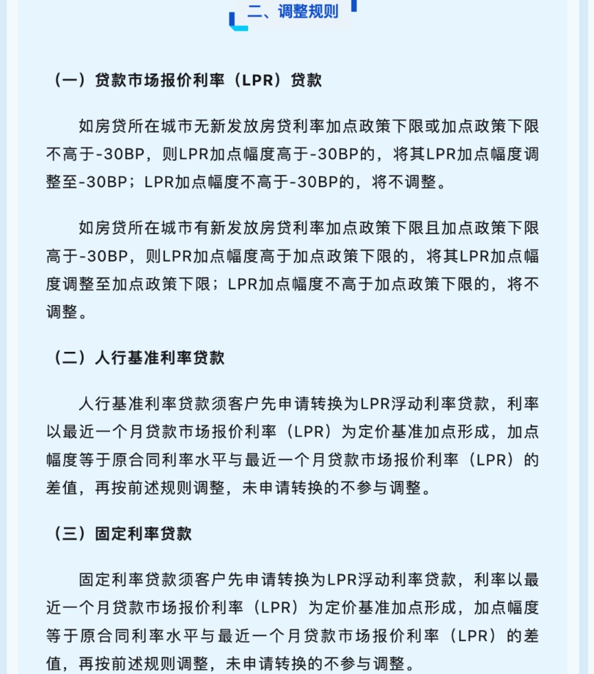 1.除北京、上海、深圳的二套及以上住房贷款外,对其他地区纳入本次批量调整的存量房贷,以及北京、上海、深圳地区纳入本次批量调整的首套房贷款,统一将利率在LPR基础上的加点幅度批量调整为-30BP,新的利率即日生效。