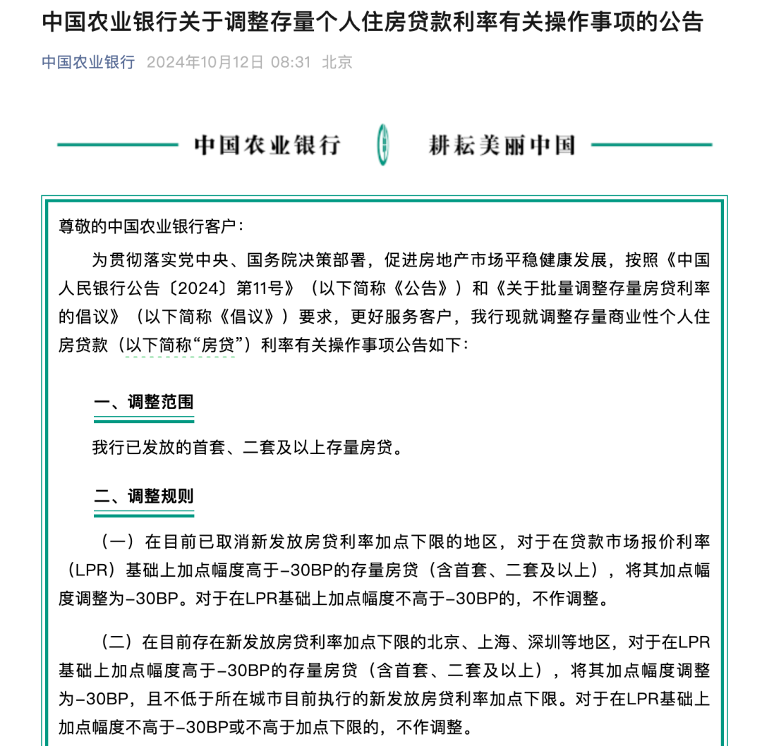 农业银行也宣布,为贯彻落实党中央、国务院决策部署,促进房地产市场平稳健康发展,按照《中国人民银行公告〔2024〕第11号》(以下简称《公告》)和《关于批量调整存量房贷利率的倡议》(以下简称《倡议》)要求,更好服务客户,农业银行现就调整存量商业性个人住房贷款(以下简称“房贷”)利率有关操作事项公告如下: