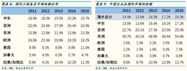 近几年,受到全球经济疲软和国际油价下跌等因素的影响,国际工程市场规模有所下降,而中国海外承包工程业绩逆势上升,市场份额不断扩大。2015年中国入选ENR250强的65家企业,海外市场收入936.74亿美元,同比2014年的896.7亿美元增长了4.46%,明显高于同期ENR250强全部海外市场收入-6.69%的增速。中国在ENR250强的海外市场份额由2012年的13.1%上升到2015年的19.3%,其中在亚洲、非洲等优势区域市场份额大幅提升,分别达到25%、54.9%。中国在ENR250入选的企业数量、海外营业额均位列世界第一。