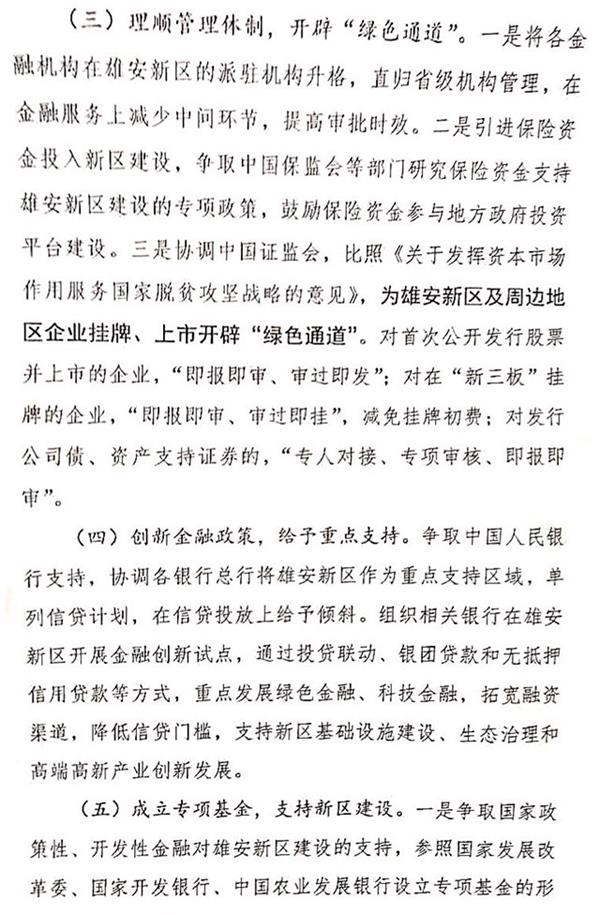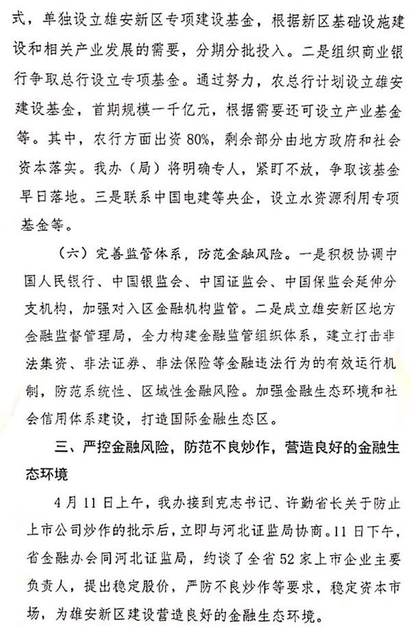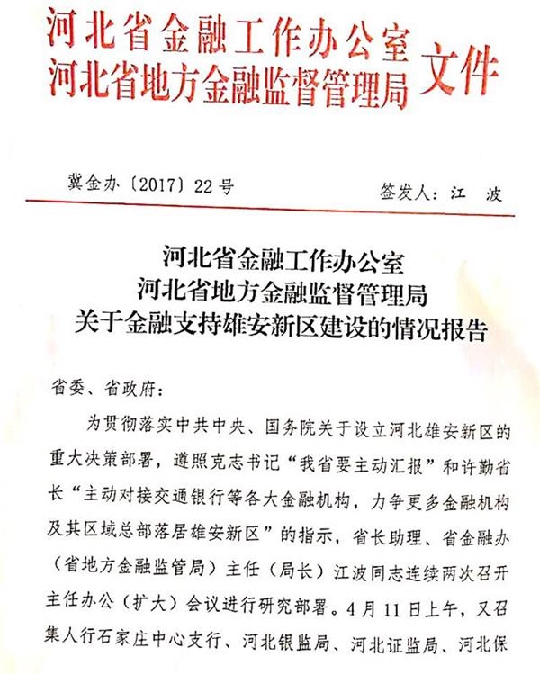 4月13日,新三板在线获得一份名为《关于金融支持雄安新区建设的情况报告》(下称“报告”)的红头文件。