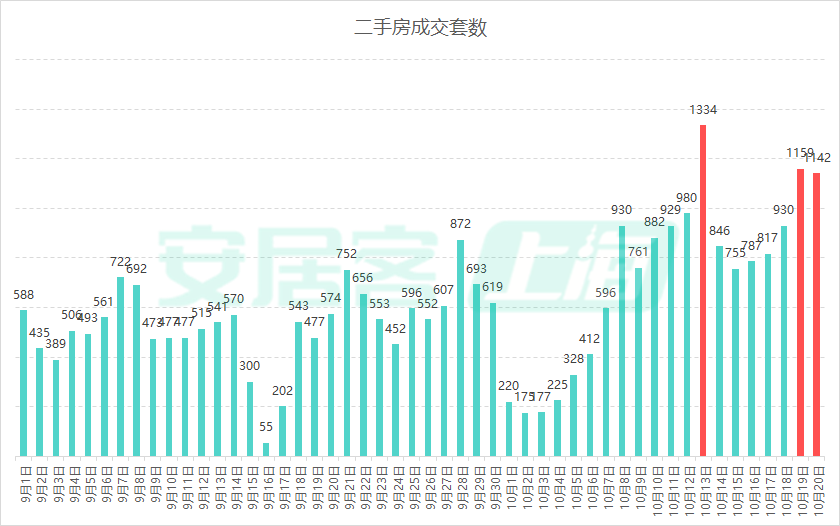 上海二手房周末网签量连续两天破千套。其中,10月19日(周六)成交1159套,10月20日(周日)成交1142套。