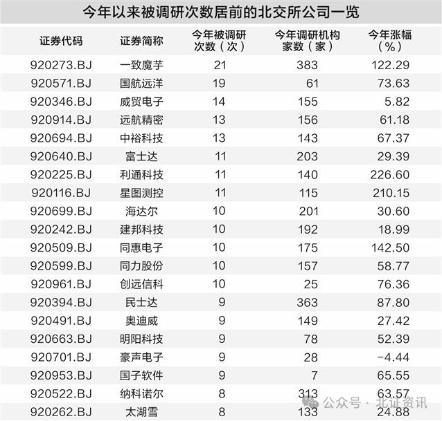 从调研频次上,总共有13家北交所公司今年被调研超过10次,其中一致魔芋年内被21次调研领跑,国航远洋、威贸电子分别获调研19次和14次。从机构调研家数看,一致魔芋、民士达、纳科诺尔分别吸引383家、363家、313家机构调研。