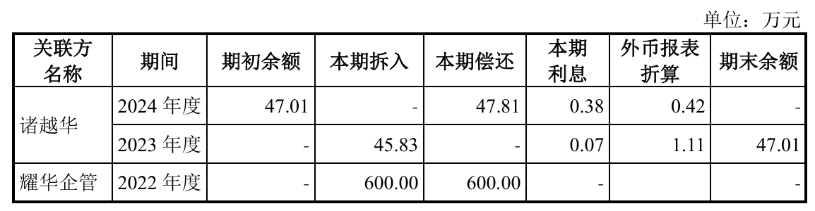 2015年9月,股东诸越华向英国耀泰提供5万英镑借款。2023年11月,欧洲耀泰受让股东王海持有的英国耀泰13%股权,取得控制权后将其纳入合并报表。由此,诸越华与英国耀泰的资金往来构成关联方交易。2024年6月,英国耀泰向诸越华偿还全部借款本息。
