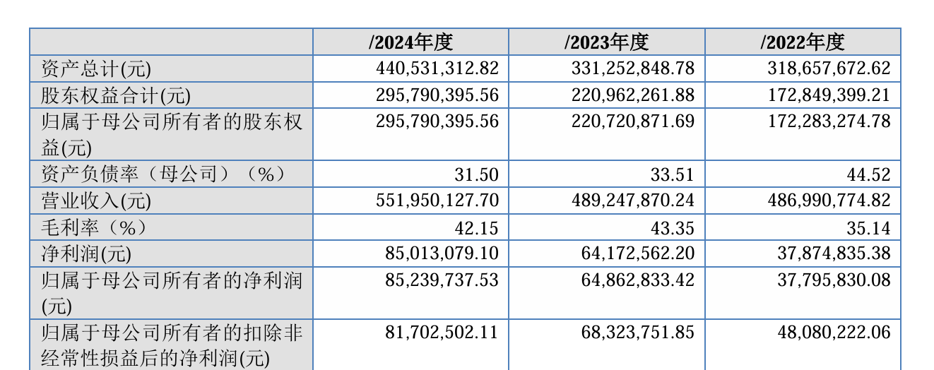 2022年至2024年(下称“报告期”),耀泰股份营业收入分别为4.87亿元、4.89亿元、5.52亿元;归母净利润分别为3779.58万元、6486.28万元、8523.97万元。