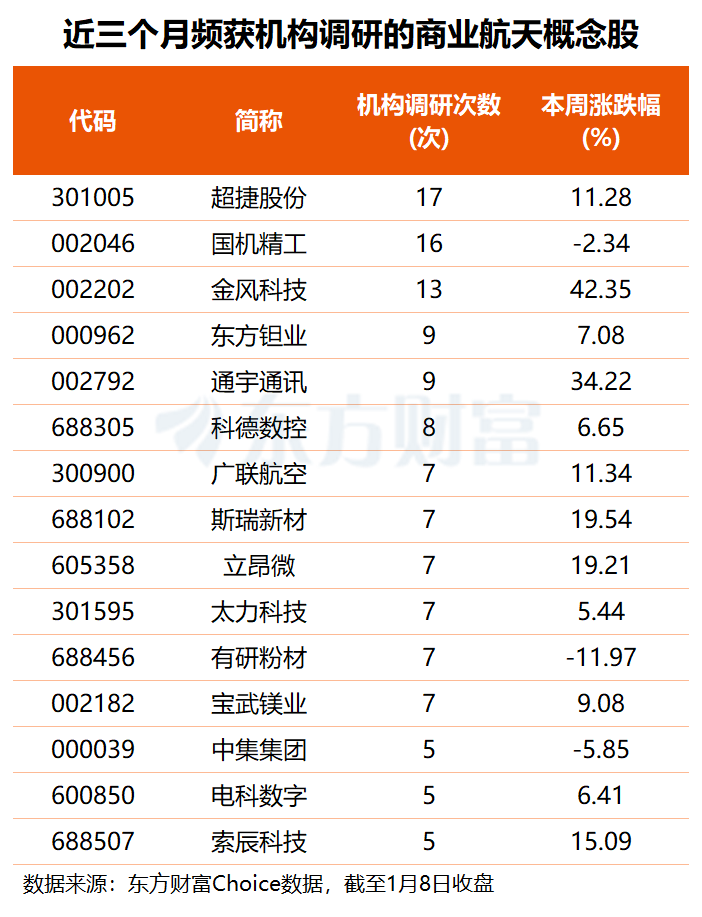 东方财富Choice数据显示,近三个月来,31只商业航天概念股获得3次以上机构调研。其中,超捷股份机构关注度最高,公司近三个月共获17次机构调研;国机精工、金风科技分别获16次和13次机构调研;通宇通讯、广联航空、斯瑞新材、太力科技等9股的机构调研频次均在5至10次之间。