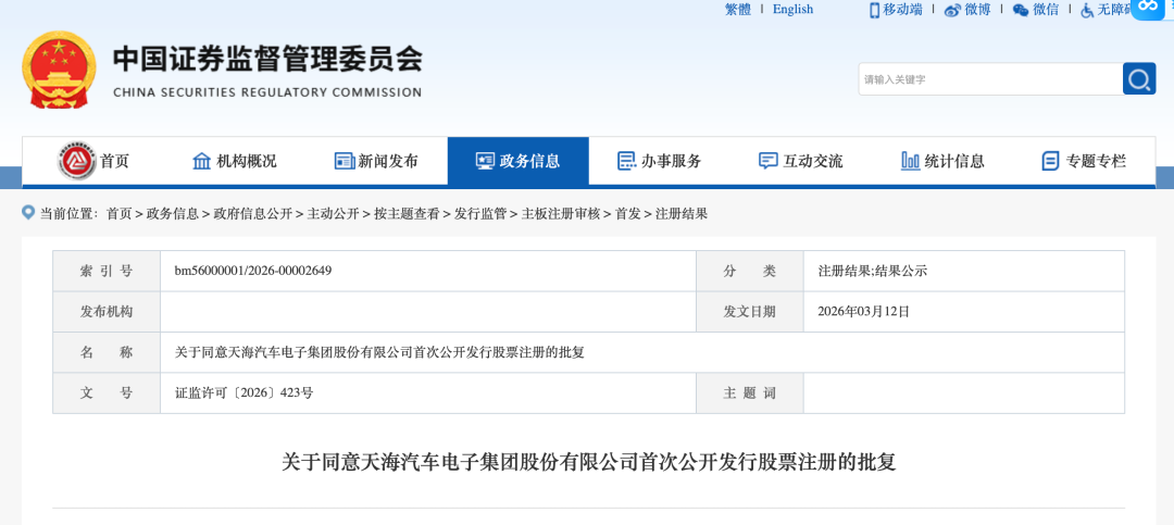 3月12日,证监会发布《关于同意天海汽车电子集团股份有限公司首次公开发行股票注册的批复》。