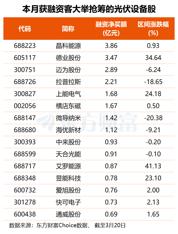 资金层面,东方财富Choice数据显示,3月以来,共36只光伏设备股获得融资净买入,晶科能源、德业股份分别获杠杆资金加仓3.86亿和3.47亿元,迈为股份、拉普拉斯融资净买额分别为2.89亿、2.21亿元,上能电气、横店东磁等4股均获融资客超1亿元抢筹。