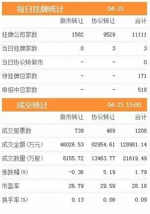昨日新增挂牌企业3家,截至2017年4月25日,挂牌企业总数达到11111家。