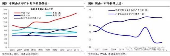 结构看中国非金融企业杠杆偏高,国企尤甚。虽然中国政府和居民杠杆率不高,但中国非金融企业部门杠杆率高达166.2%,不仅高于金砖国家均值49.1%,也远超美、欧、日等发达经济体均值90.1%。结合中国社科院发布的国家资产负债表,我国政府、居民、非金融企业部门杠杆率自2008年以来总体均呈上升趋势,但是非金融企业部门杠杆率无论从绝对值还是增速均大于政府和居民部门,2016年三季度非金融企业负债占全社会负债65%。从企业属性看,国企杠杆率最高,过去8年国有工业企业杠杆率由56%升至62%,私企工业企业杠杆率由59%降至52%,国企加杠杆是2008年金融危机后我国非金融企业杠杆快速攀升的重要原因。