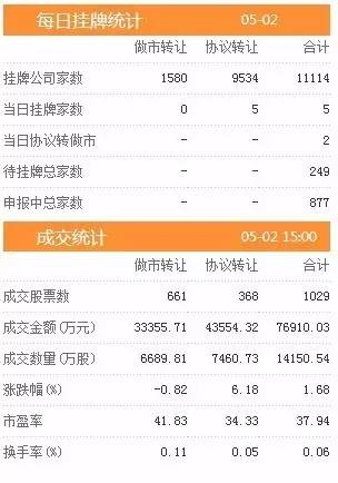 昨日新增挂牌企业5家,截至2017年5月2日,挂牌企业总数达到11114家。